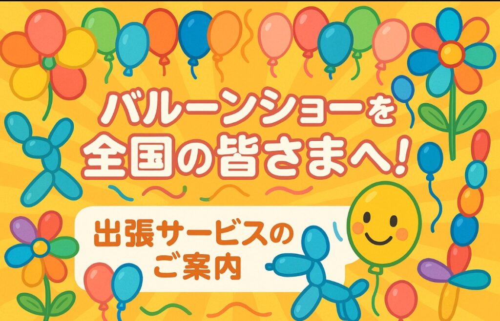 「出張バルーンショー」をお探しの皆さまへ。お子様の誕生日会、企業イベント、地域のお祭りや記念日パーティーなど、さまざまなシーンで大活躍のバルーンショーを全国どこへでもお届けします!